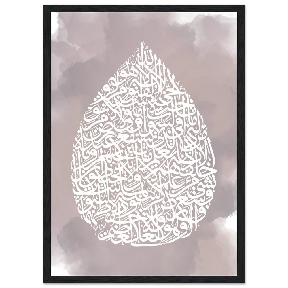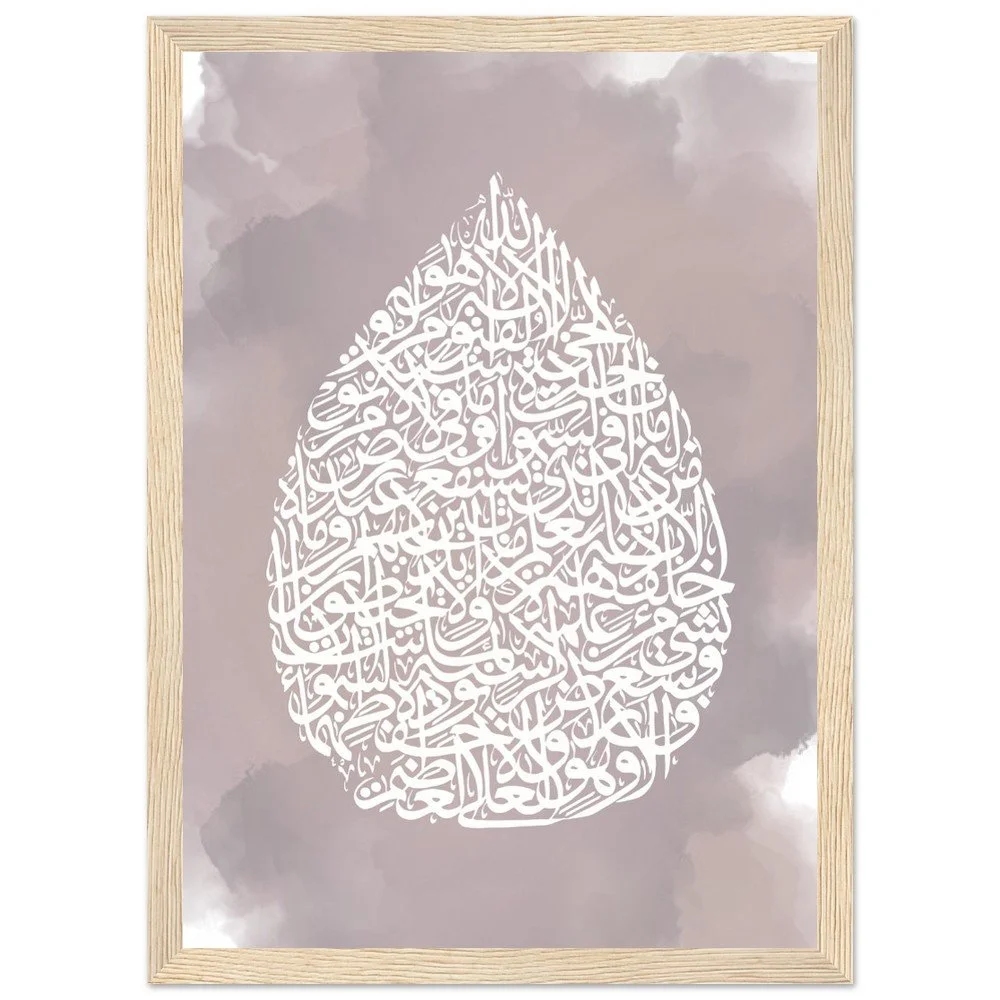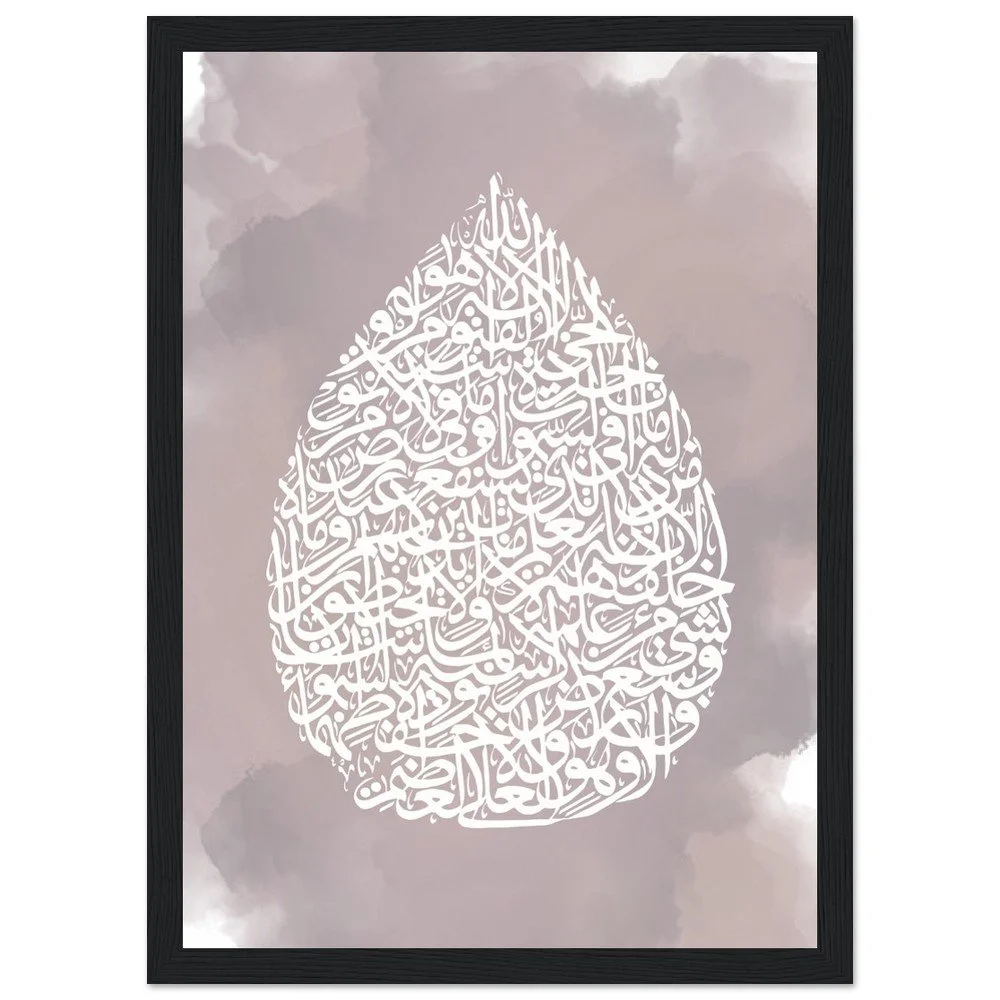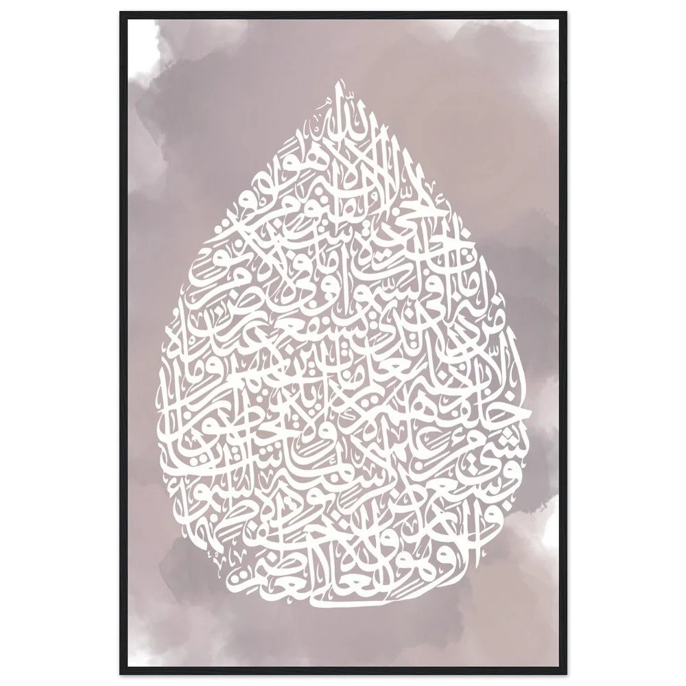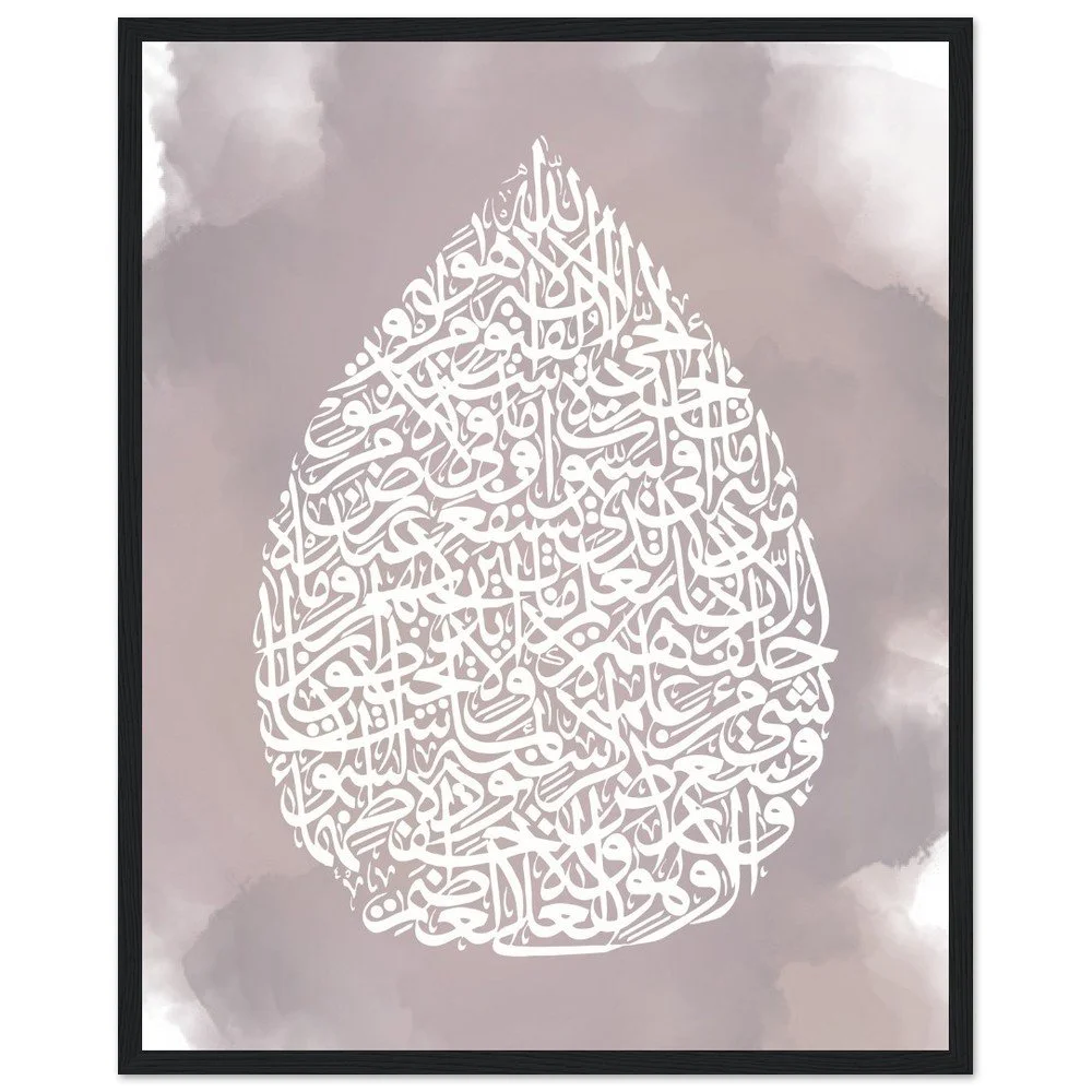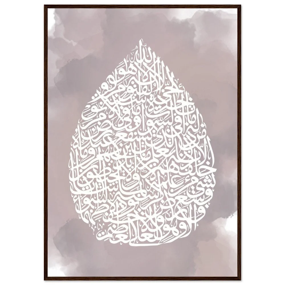 A framed family tree of Prophet Muhammad on a wall, with a gray vase and a black vase with dried leaves on a shelf below.