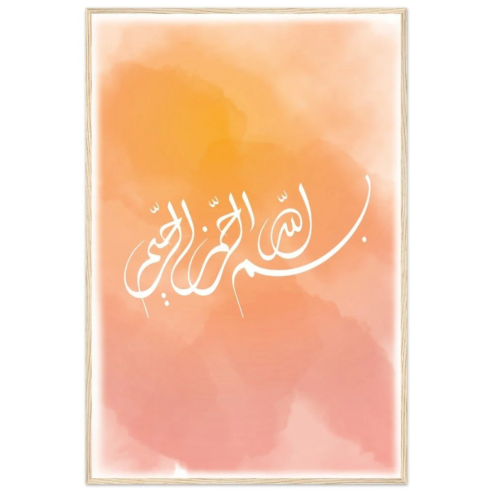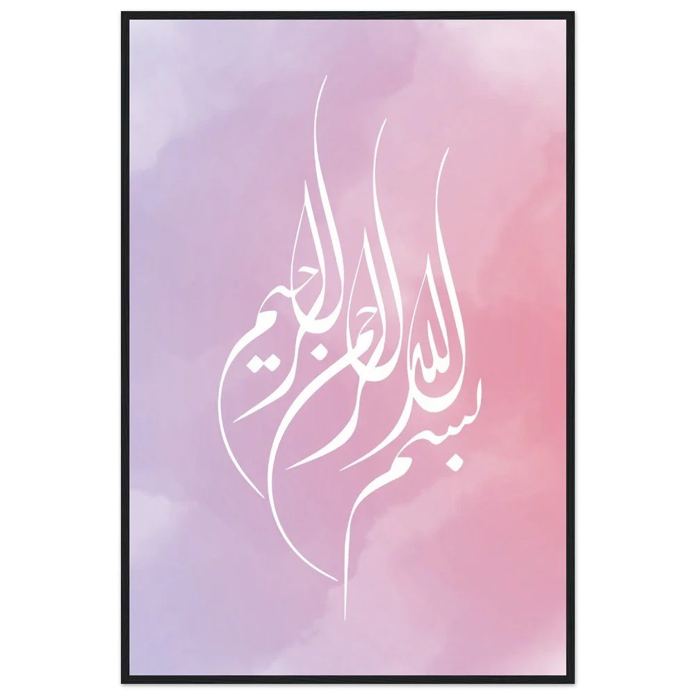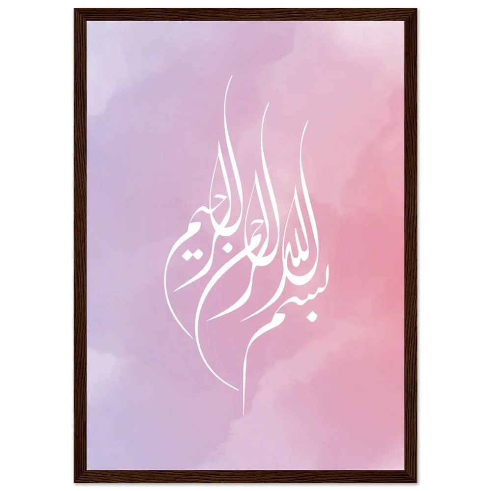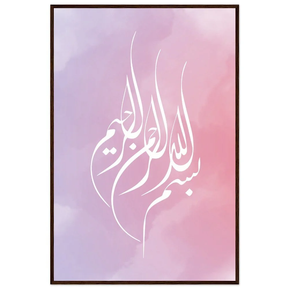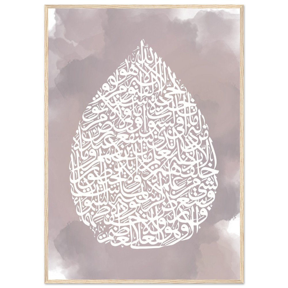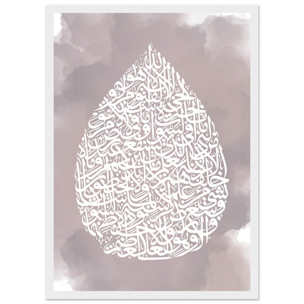 A framed family tree of Prophet Muhammad on a wall, with a gray vase and a black vase with dried leaves on a shelf below.