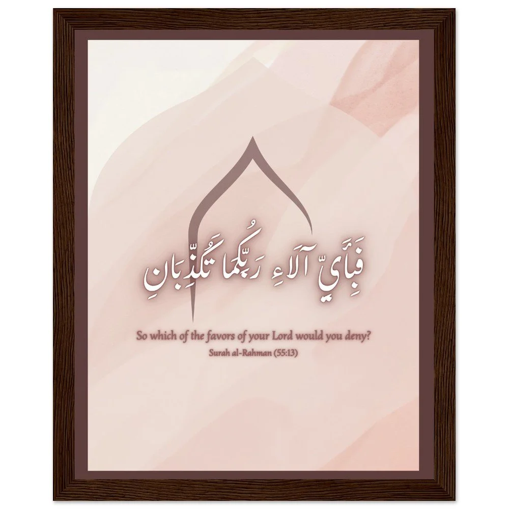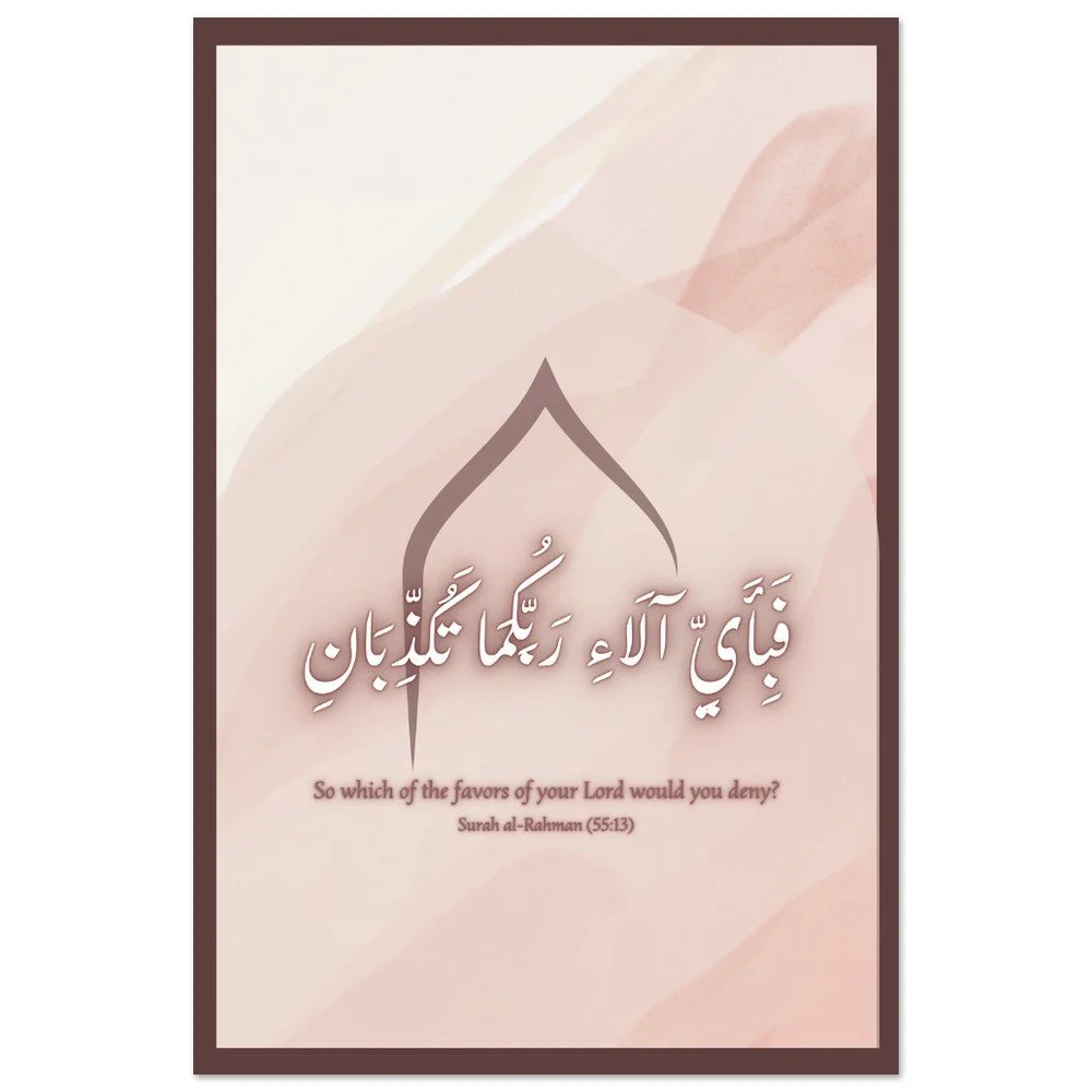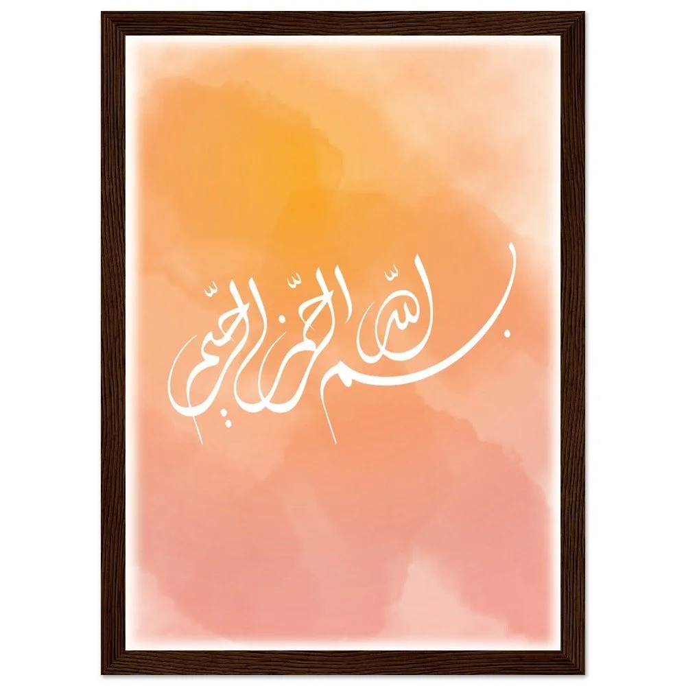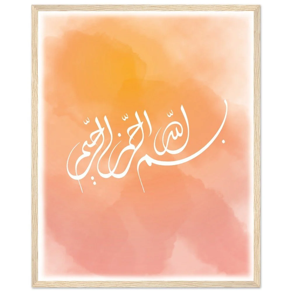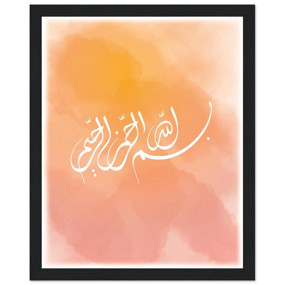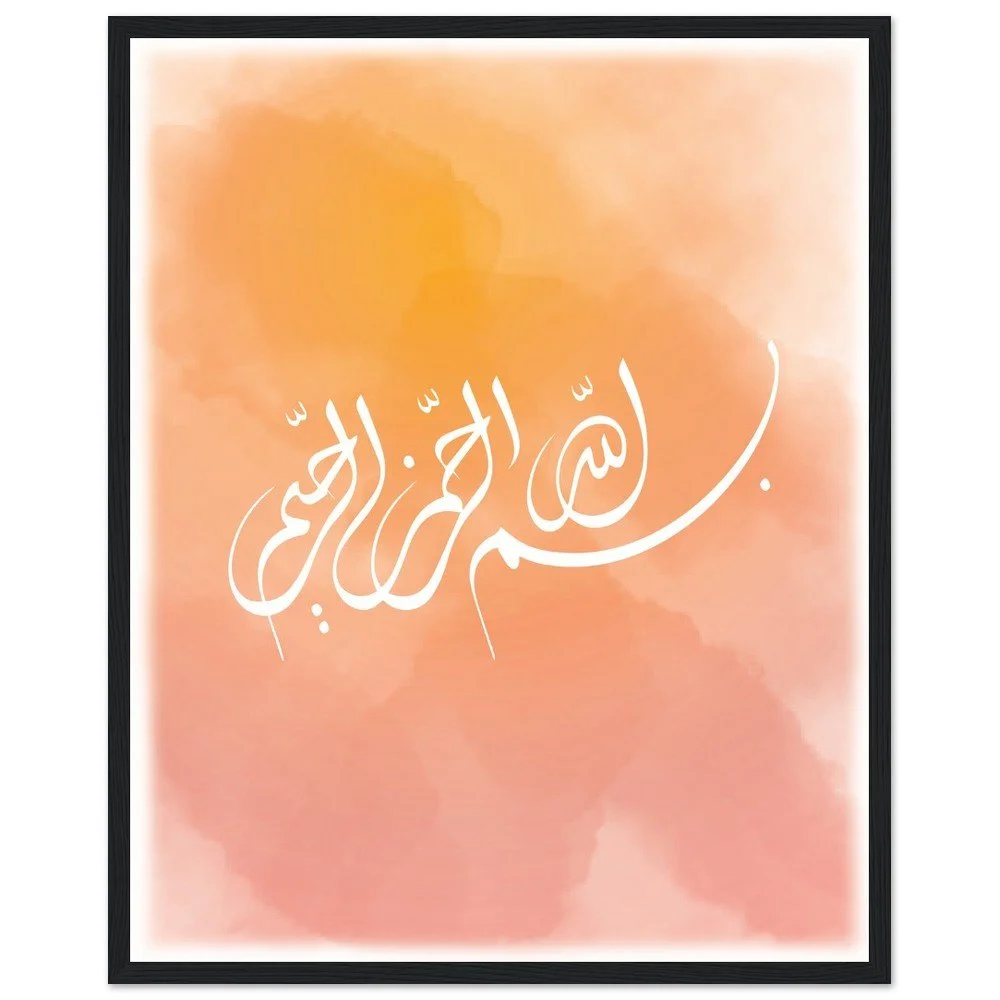 A framed family tree of Prophet Muhammad on a wall, with a gray vase and a black vase with dried leaves on a shelf below.